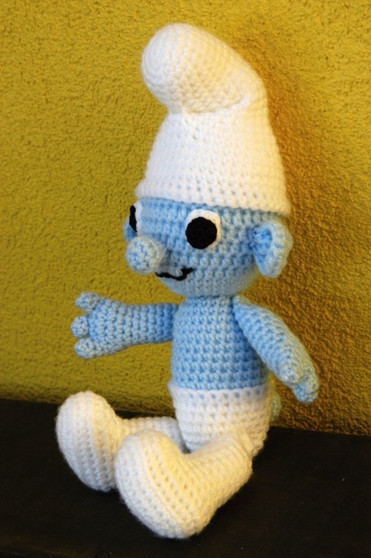 Syn má rád Šmoulíčky a nelíbili se mu ti plyšoví :-), tak jsem mu jednoho uháčkovala. Návod jsem našla na internetu volně ke stažení