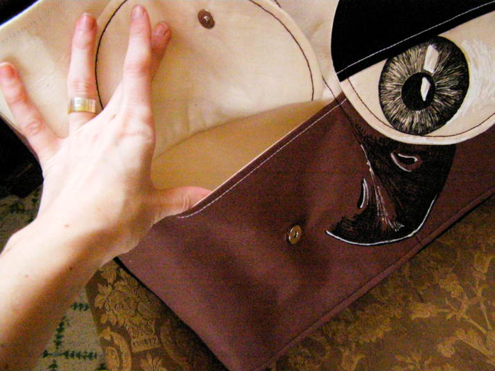 Kabelka šitá zakázkově, detail řešení kapes - očí.