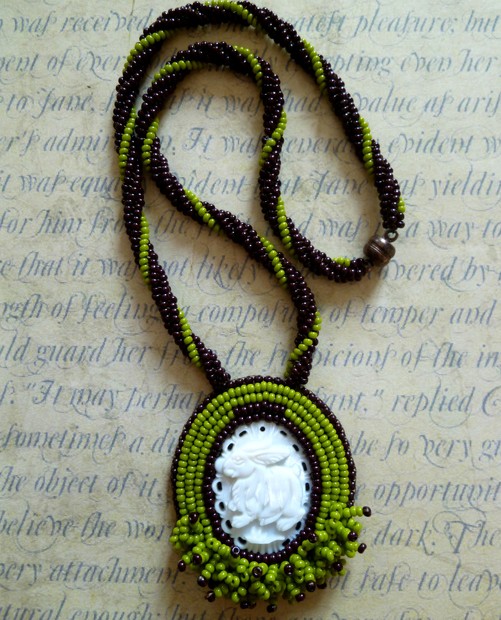 Krásná perleťová kamej od martapa-materiál obšitá na plsti rokajlem Preciosa. Zavěšeno na herringbone spirále, zapínání magnetické v barvě mědi