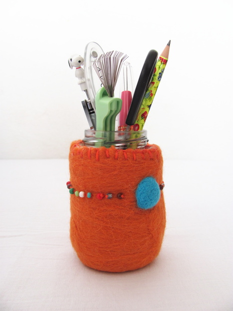 Původně to mělo být pouzdro na mobil, jenže při práci vlna začla tvořit kulatý tvar a tak je z toho stojánek. :)