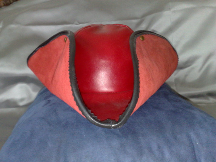 Klobouk třírohý zhotovený z barvené, červené kůže...