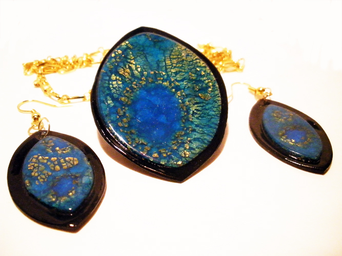 Set náhrdelníku a náušnic vytvořený technikou mokume nendo z modrého a černého Fima, zlatých kovových plátků a zlatých bižuterních komponentů