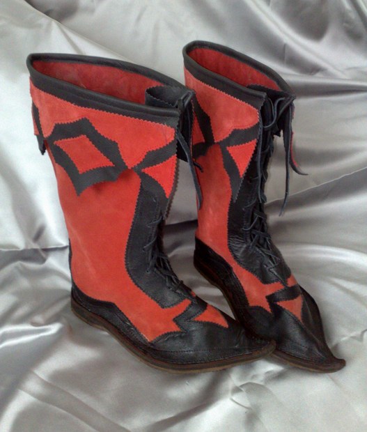 Vysoké boty šněrovací z červéné kůže s černým zdobením.Pro šermíře.