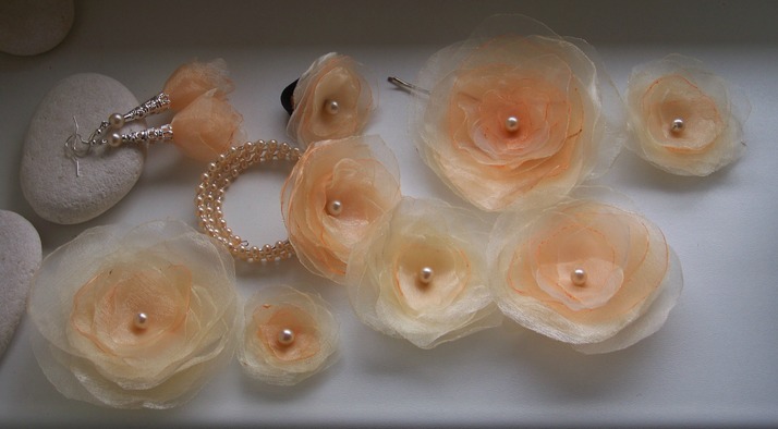 Sada vyrobená na míru na maturitní ples - náušnice, květina do vlasů, náramek, prstýnek a květiny na šaty.