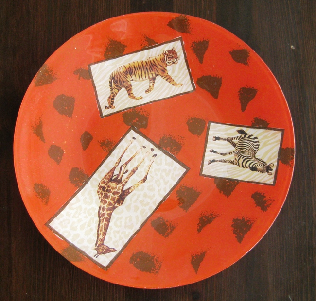 skleněný talíř zdobený ubrouskem a akrylovými barvami