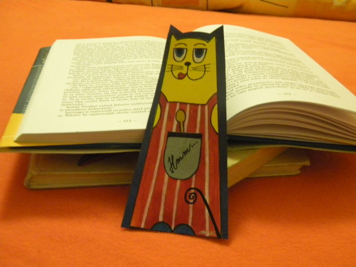Záložka je vyrobena z tvrdé barevné čtvrtky a barevného papíru (pozadí).
