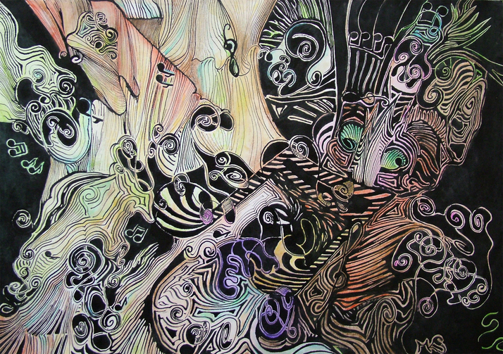 Perokresba s akvarelovými pastelkami, darováno hudebníkovi ze skupiny Volant.