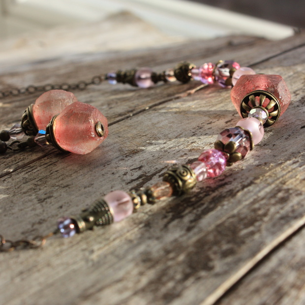 souprava náušnic a náhrdelníků ze skleněných korálků v barvě růžové a kovových korálků v barvě starozlaté