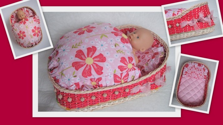 Postýlka upletena z pedigového proutí. Prostěradlo, polštárek a peřinku jsem ušila....