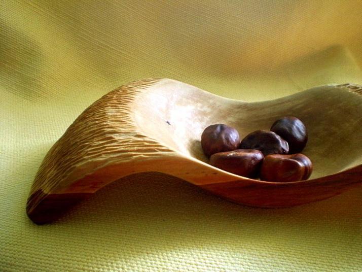 Originálne riešená bytová dekorácia v tvare dvojitej vlny s ručnou rezbou po oboch stranách misy. To všetko jej dodáva punc výnimočnosti. Dá použiť pre hladošov na suché potraviny, na ovocie, chlieb, oriešky, či iné suché sladkosti, či slanosti. Je ekologická upravená ľanovým panenským olejom.