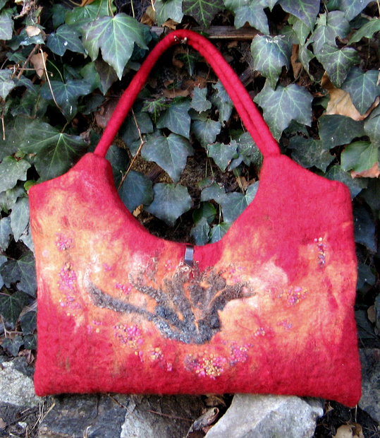 Kabelka ušitá z ručně zhotovené plsti z merina a shetlandské vlny. Zdobí ji vlněné barvené nopky a přírodně hnědé rouno BFL. Tahle kabelka už má svoji majitelku ...