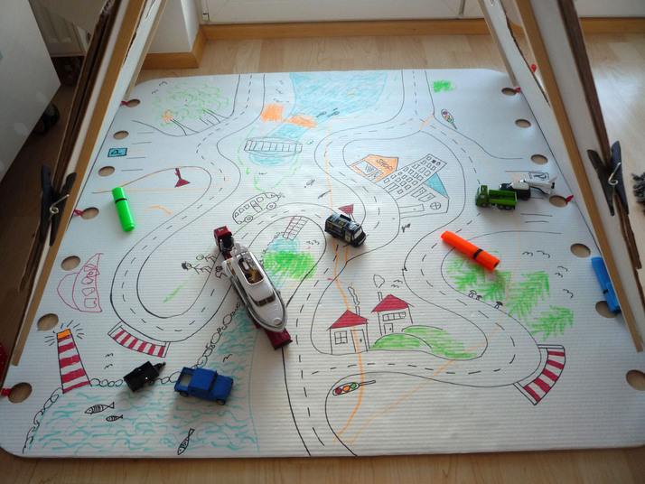 Matyáškův domeček postupně získává graficky pojatou podlahu.))