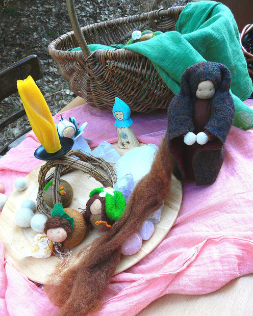 Improvizovaný roční stoleček s plstěnými semínky.