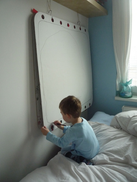 Toto je naše domácí ukázka složeného a zavěšeného domečku, který na stěně slouží jako plocha pro čmárání. Já jsem Matýskovi nakreslila po obvodě černou čáru, aby jsem mu vymezila prostor s tím, že za čáru se nekreslí. No uvidíme, jak to dopadne))