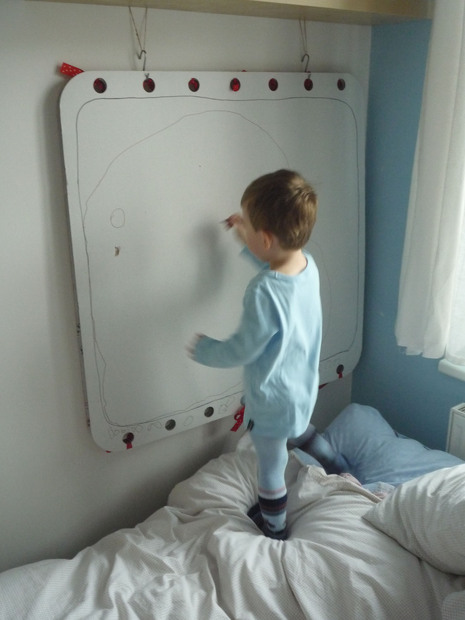 Toto je naše domácí ukázka složeného a zavěšeného domečku, který na stěně slouží jako plocha pro čmárání. Já jsem Matýskovi nakreslila po obvodě černou čáru, aby jsem mu vymezila prostor s tím, že za čáru se nekreslí. No uvidíme, jak to dopadne))