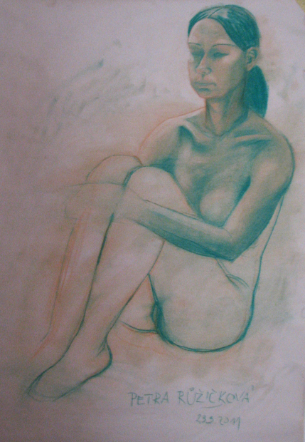 Kresba zeleným a tělovým pastelem na balícím papíru. Formát cca 70x100cm