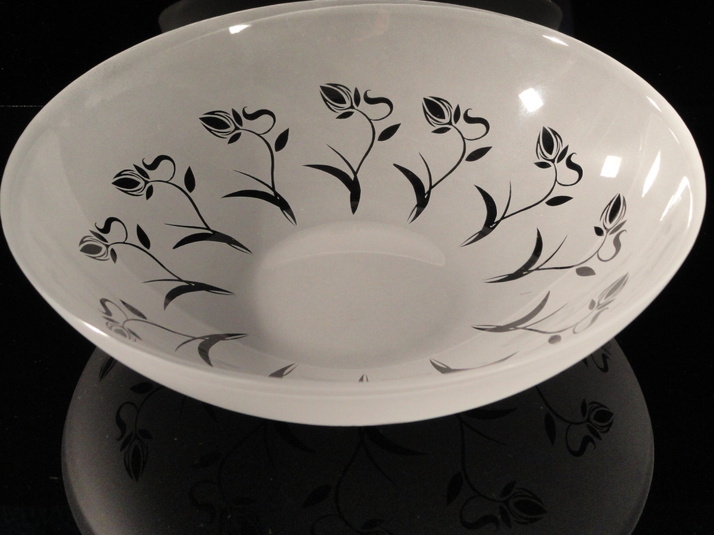 Originální talíř z čirého skla zhotovený technikou pískování, vnitřní strana je hladká, vnější pískovaná. Průměr 28 cm, výška 10 cm. Na přání vyhotovíme jakýkoliv dekor. Každý kus je originál. Na požádání vyhotovíme i tištěný certifikát originality.