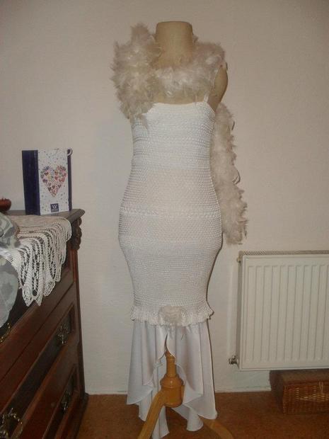 Bílé, viskozové, háčkované šaty, zdobené saténovým volánem, vypodšívkované strečovým žerzejem...variabilní, po odejmutí volánu se ze společenských stanou letními šaty :-)
