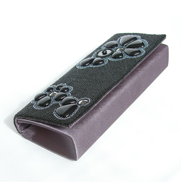 Celá přední i vrchní strana kabelky je pokryta ruční výšivkou z drobných korálků černé a stříbrné barvy. Lístky abstraktních květů z černého skla pochází z dílny umělecké sklářky, středy jsou tvořeny blyštivými kamínky od firmy Swarovski a vše je doplněno o donut z hematitu s černým broušeným korálkem uprostřed.