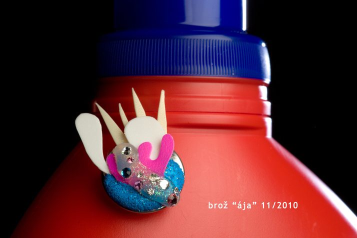 Brož vyrobená z obalů od Vanishe a vlasových šampónů.