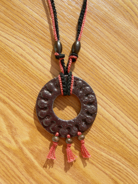 Náhrdelník z fima, dřevěných korálků a bavlněných šňůrek.