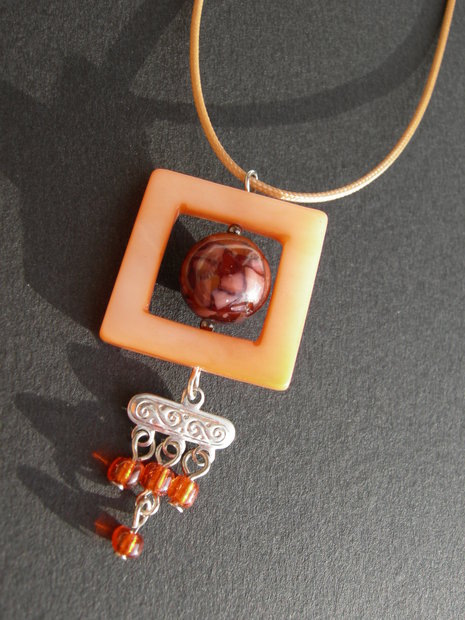 Oranžově zbarvený náhrdelník vhodný např. na ples. Je seskládán z oranžových perleťových čtverečků, rokajlu, platinového ramínka a červené minerální koule.