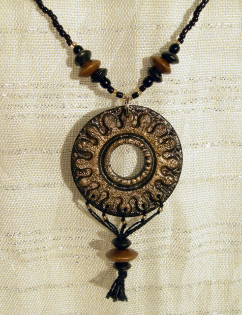 Zlatavý náhrdelník vytvořený z černého fima. Je doplněný dřevěnými korálkami a visí na šňůrce z rokajlu.