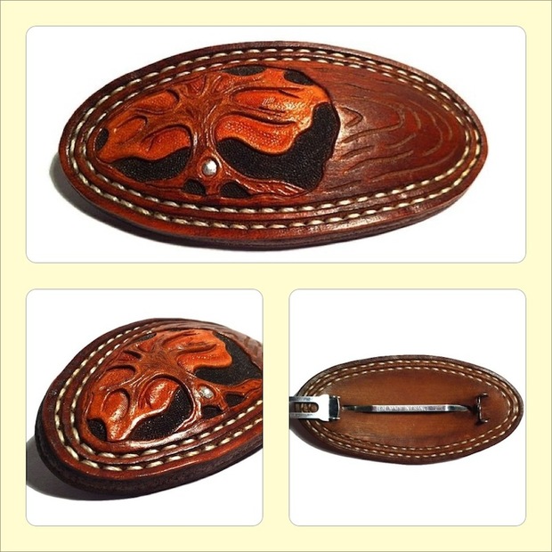Ručně šitá a zdobená kožená spona do vlasů