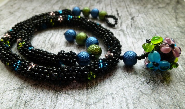 vinutka, cat, vinutá perla, černá, peyote, dutinka, voskovky, spirála, kytičky, Opět nádherná vinutka od Cat zavěšena na peyote dutince, ve které jsou po celé délce spirálovitě vyšité kytičky v barvách květinek na vinutce ... doplněno voskovkami..šité zapínání. Použitý rokajl značky Preciosa