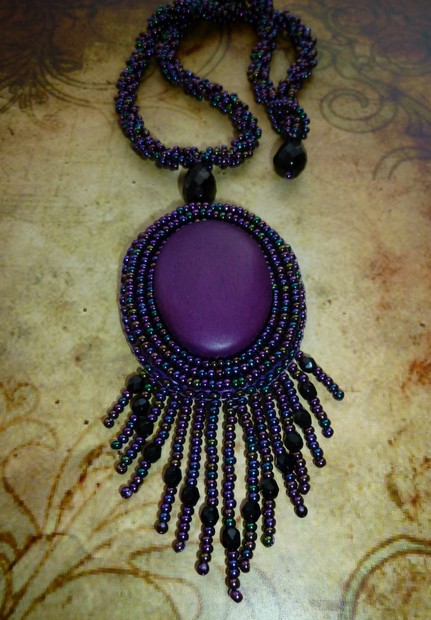 Luxusní náhrdelník - na plsti obšitý dřevěný valounek, použitý český rokajl s iris úpravou v metalických duhových odstínech, doplněno černými ohňovkami. Zavěšeno na spiral rope. Náušničky jsou tvořeny broušenými korálky s použitím bižuterních komponentů v černé barvě. celková délka náhrdelníku 44 cm, přívěšek včetně trásniček 9x5 cm, délka náušniček 4 cm.