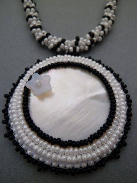 Perleťový plátek obšitý na plsti rokajlem Preciosa v perleťové bílé a černé barvě, zavěšený na spiral rope. Průměr přívěsku 5 cm, délka spirály 38 cm. Opět šité zapínání, takže náhrdelník vhodný i pro ty, co mají alergii na bižuterní kovy...