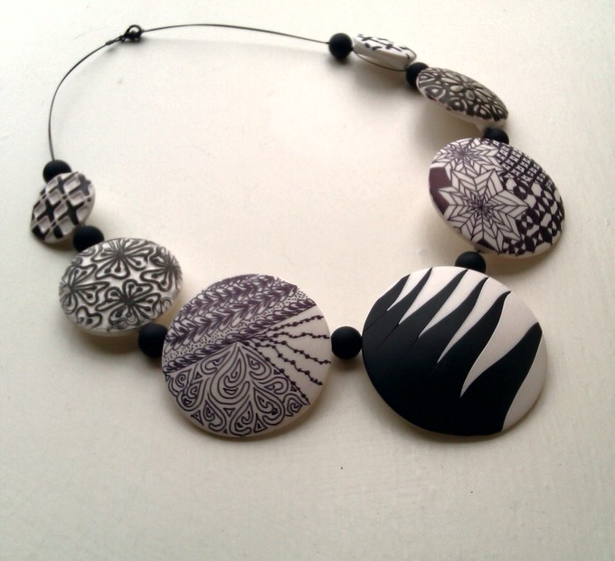 Náhrdelník z vypouklých kulatých dílů vyrobených rozličnými technikami z Fima, doplněno matnými skleněnými korálky