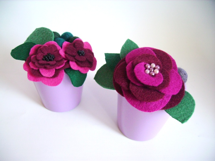 Kytičky ušité z plsti naaranžované v malých květináčích.