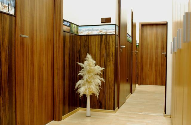 použití oleje jako výtvarného prvku v celé délce chodby jako součást obložení