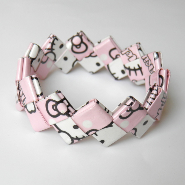 Náramek vyrobený pomocí metody Candy bag - z balícío papíru s motivem Hello Kitty