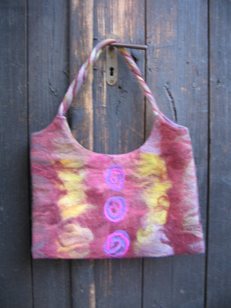 Šitá kabelka z ruční plsti. Bavlněná podšívka s kapsami, zapínání na zdrhovadlo.