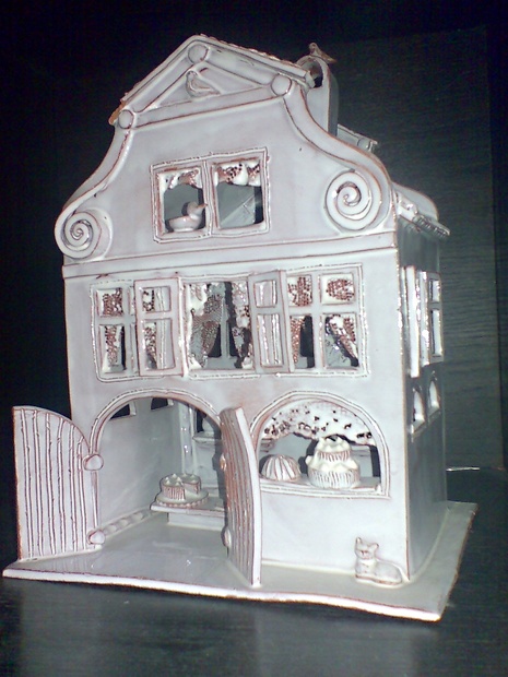 keramická cukrárna se skvěle propracovanými detaily(záclonky, kočka za dveřmi, holoubek na komíně, bábovka a dorty na okně, pohoštění na stole uvnitř), která slouží i jako lampička, protože má vzadu otvor na protažení el. šňůry.
