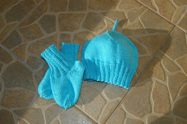 Bavlněná čepička a ponožky pro miminko v tyrkysové barvě. Pleteno na pěti jehlicích, takže beze švů, které by mohly miminko případně tlačit.