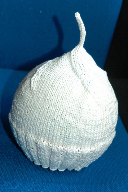 Bavlněná čepička pro miminko v bílé barvě. Pleteno na pěti jehlicích, takže beze švů, které by mohly miminko případně tlačit.