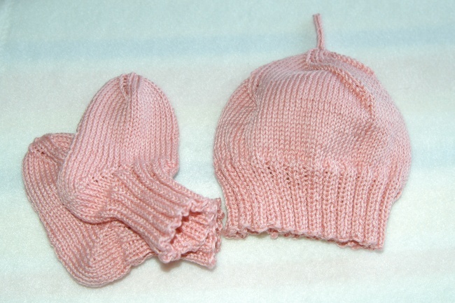 Bavlněná čepička a ponožky pro miminko v růžové barvě. Pleteno na pěti jehlicích, takže beze švů, které by mohly miminko případně tlačit.