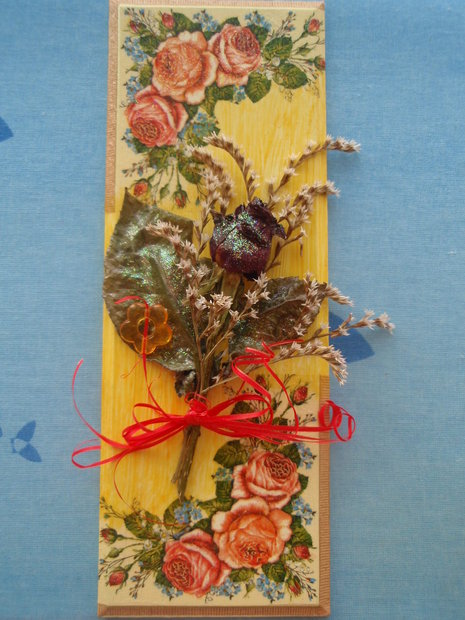 Obrázek je kombinován s ubrouskovou technikou a sušenými květinami.