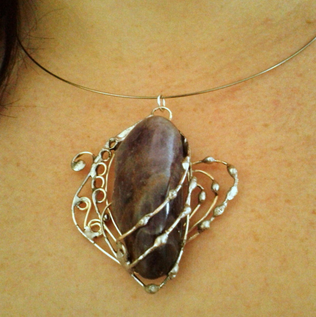 valounek ametystu 4,3 cm na výšku, celý šperk 5,3 cm na výšku a v nejširším místě má 4,5 cm