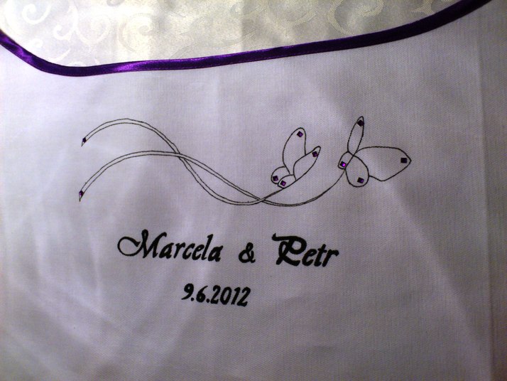 fialový novomanželský se jmény a motýli