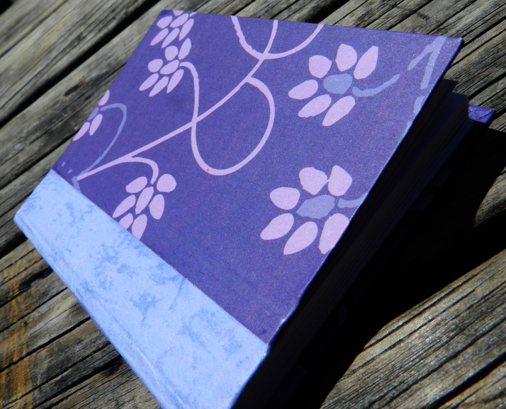 velikost A7, 60 bílých nelinkovaných listů, desky zdobí fialový papír s modrými lístečky, hřbet je z fialového strukturovaného papíru