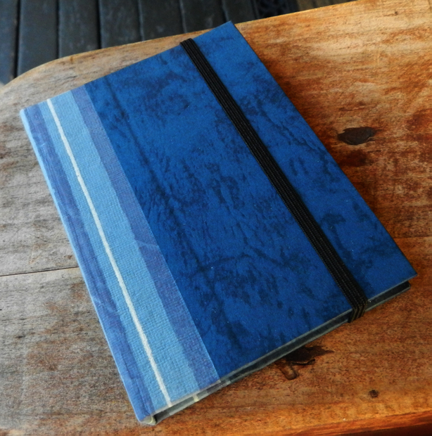 velikost A7, 60 bílých nelinkovaných listů, desky potažené tmavě modrým strukturovaným papírem, hřbet z ručního papíru s proužky v modrých odstínech, černá pruženka proti rozevírání desek