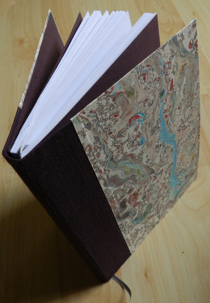 velikost A5, 84 bílých nelinkovaných listů, hřbet v tmavě fialovém strukturovaném pltáně, desky potažené ručně mramorovaným papírem, uvnitř šedá stužka jako záložka