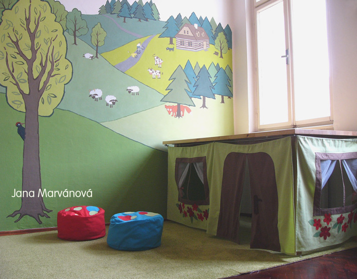Koutek pro Barunku se skládá z dvou částí: stylizovaná výmalba na stěně s motivem vysočiny (s kopci, lesy, zvířátky… i s tatínkem na kole, který veze Barunku) je první část, ta druhá je ryze textilní a obsahuje dva menší sedací vaky (najít je můžete v mém profilu v kategorii: měkké hrátky) a stěny textilního domečku pod nepoužívaným stolem, takové malé dívčí království.