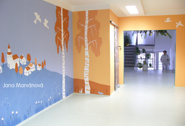 Prostor, kudy chodí klienti domova seniorů do jídelny, knihovny či kuřárny, byl oživen novou malbou. Pojala jsem jej jako procházku březovou alejí, kde občas proletí ptáček, mihne se veverka a nad květinami poletují motýli… Malba je stylizovaná jak tvarově, tak barevně. Jako převažující barvu jsem zvolila příjemné odstíny oranžové, doplněné o bílou a šedomodré tóny. V místě, kde se chodba rozšiřuje o výklenek, je motiv aleje obohacen o pohled do dáli, kde se na kopci (na přání klientů) tyčí kostel a pár domků.