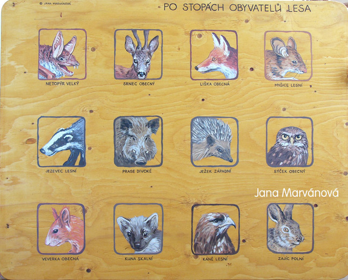 Tabule PO STOPÁCH OBYVATELŮ LESA zobrazuje 12 zvířat, jež má návštěvník poznat podle siluety a stopy namalované na odklápěcích prvcích, pod kterými se skrývá portrét zvířete.
