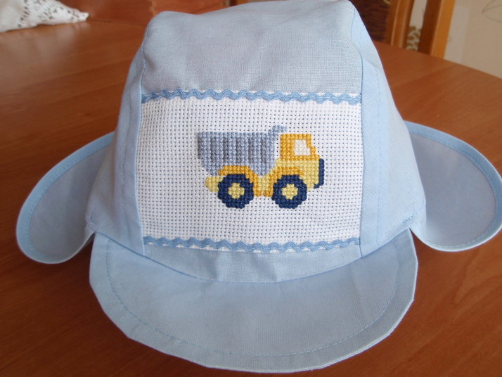 Čepka je pro cca dvouletého klučinu, vyšita křížkovou výšivkou.